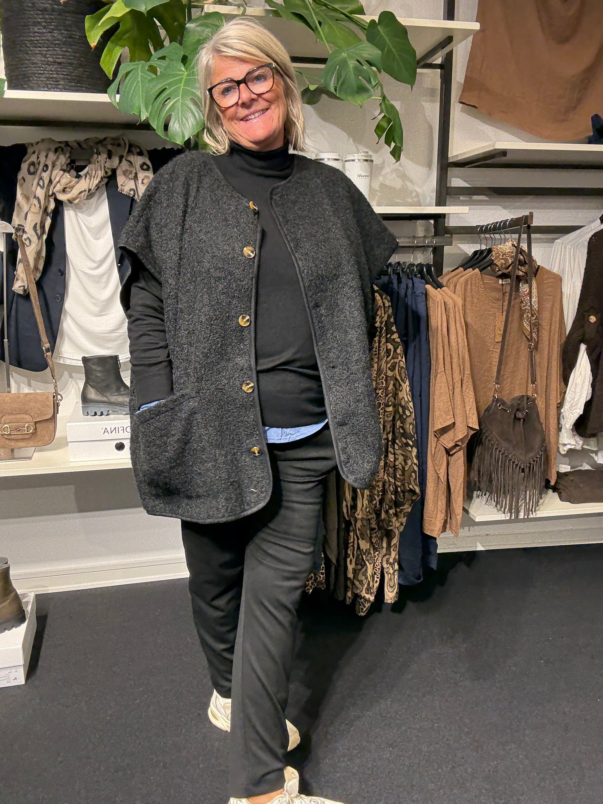 Super smart boucle vest med bred ærmegab så der kan være plads til en strik, og det tænker jeg er så fint da den så også kan bruges som et stykke overtøj.