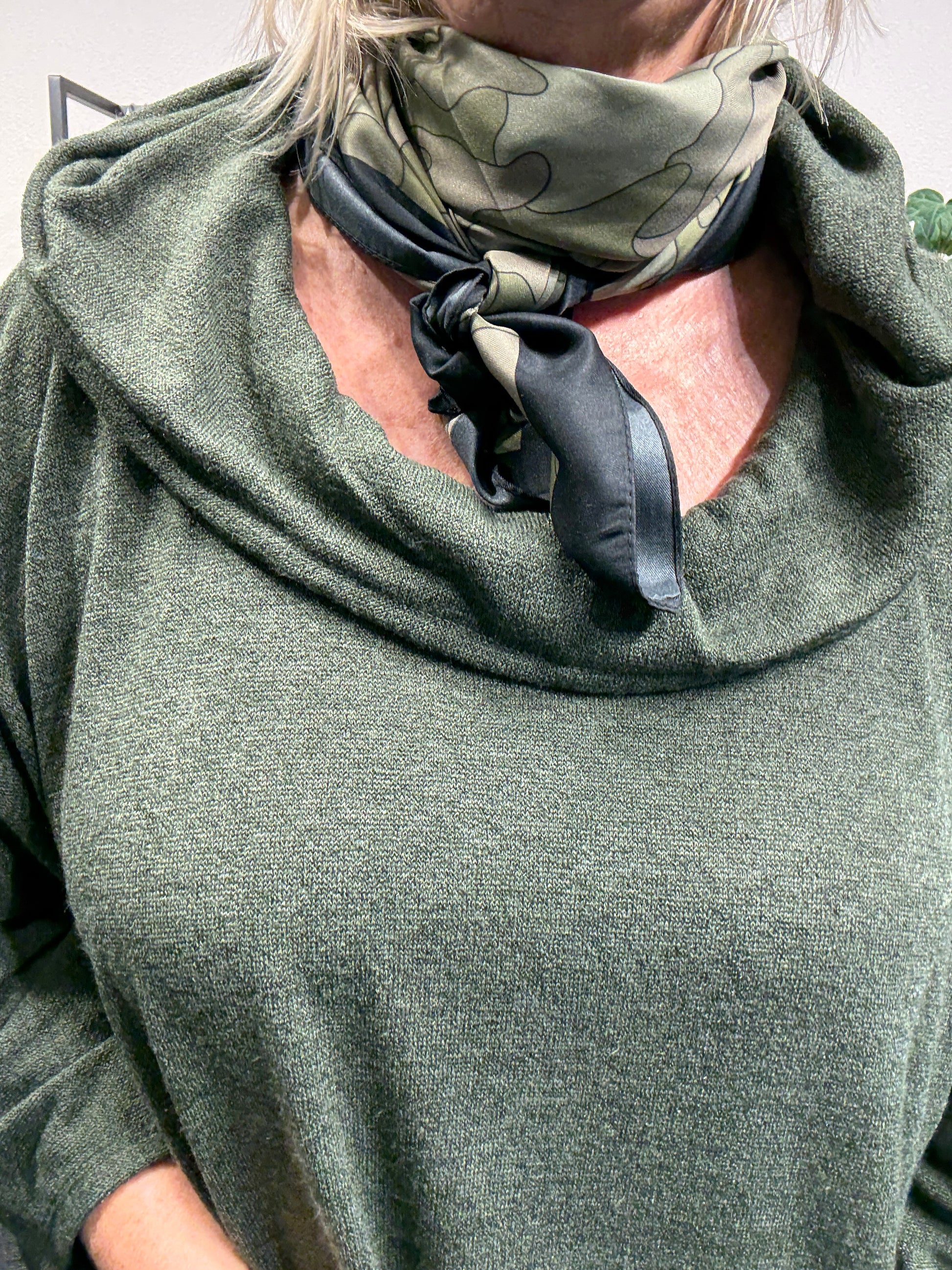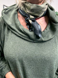 Let blød strik med rund i hals hvor der er en fald ned krave som pynt foran 3/4 langt ærme og 2 påsatte lommer foran. bagpå en løs hætte. onesize som dækker mange størrelser.