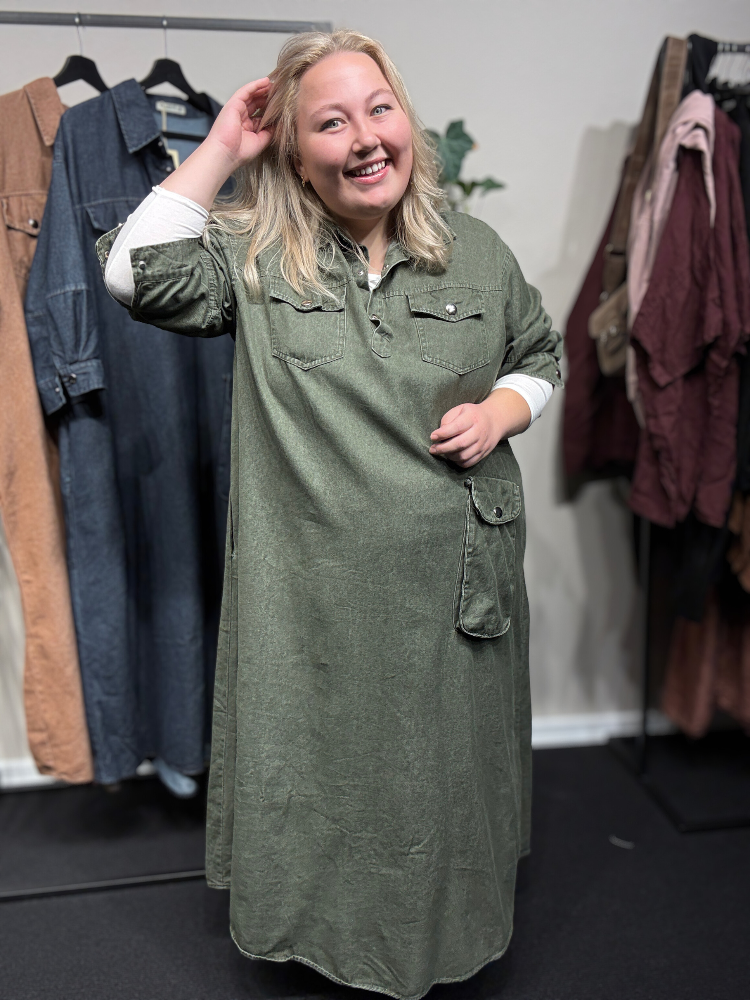 Denim kjole som har en masse smarte detaljer med trykknapper og lommer. Den er med stolpelukning og krave foroven, og har et 3/4 ærme med slids, der kan lukkes med trykknap. Udover de påsyede lommer er der også en lomme i hver side.