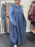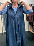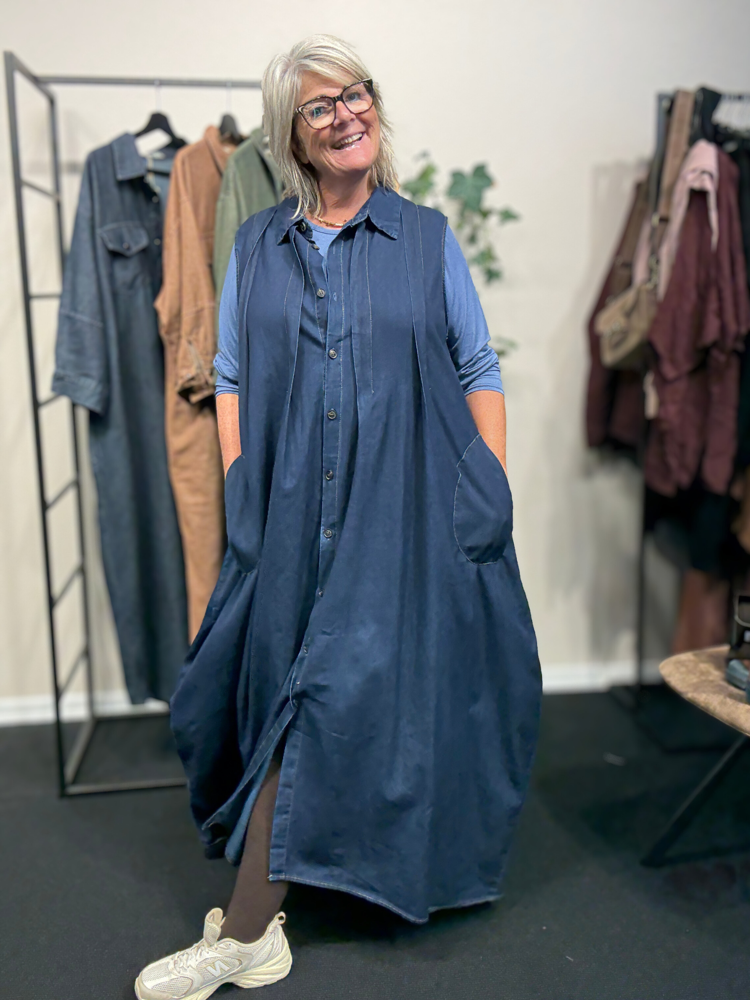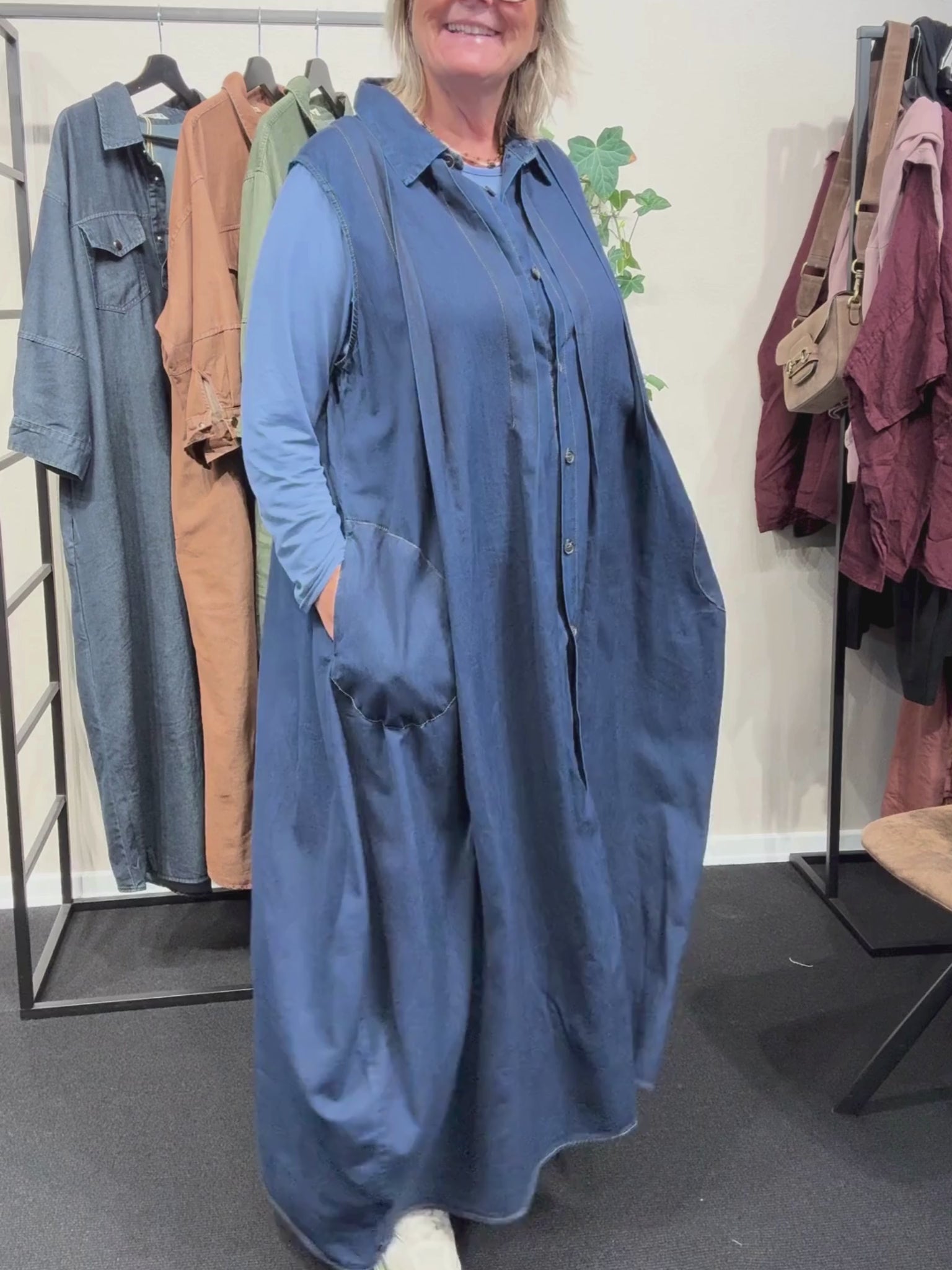 Smart kjole uden ærmer med en masse fede detaljer såsom de forskellige lag både foran og bagpå, den er med lommer, er gennemknappet så man kan bruge den både åben og lukket. Læg mærke til den gode længde - specielt til dig med lange stænger!