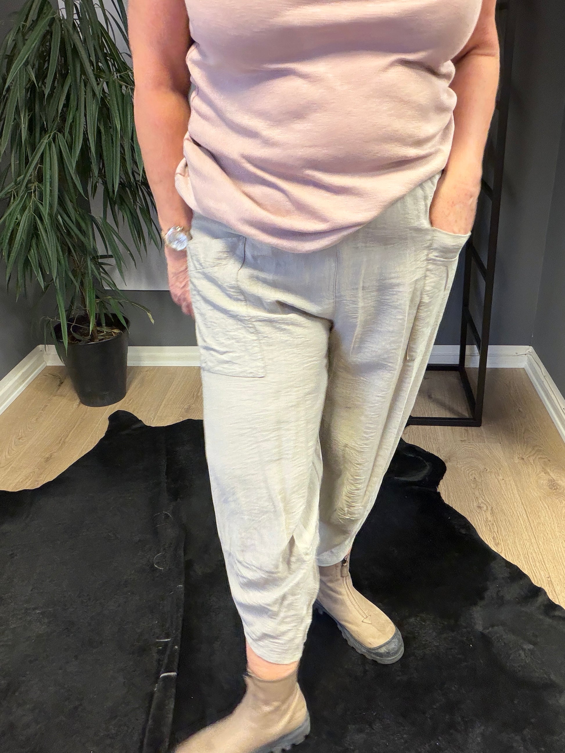 Buksen er med elastik i livet, som gør at den bliver hvor den skal. Derudover er der 2 påsatte lommer foran. 7/8 del lang med runding forneden, en virkelig fin detalje som gør buksen lettere i udtrykket.