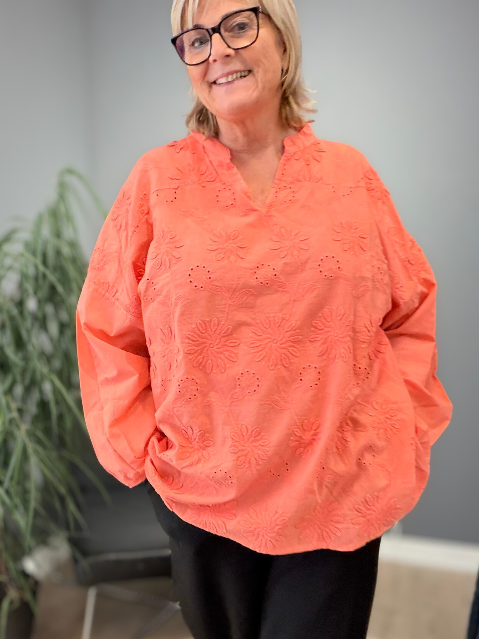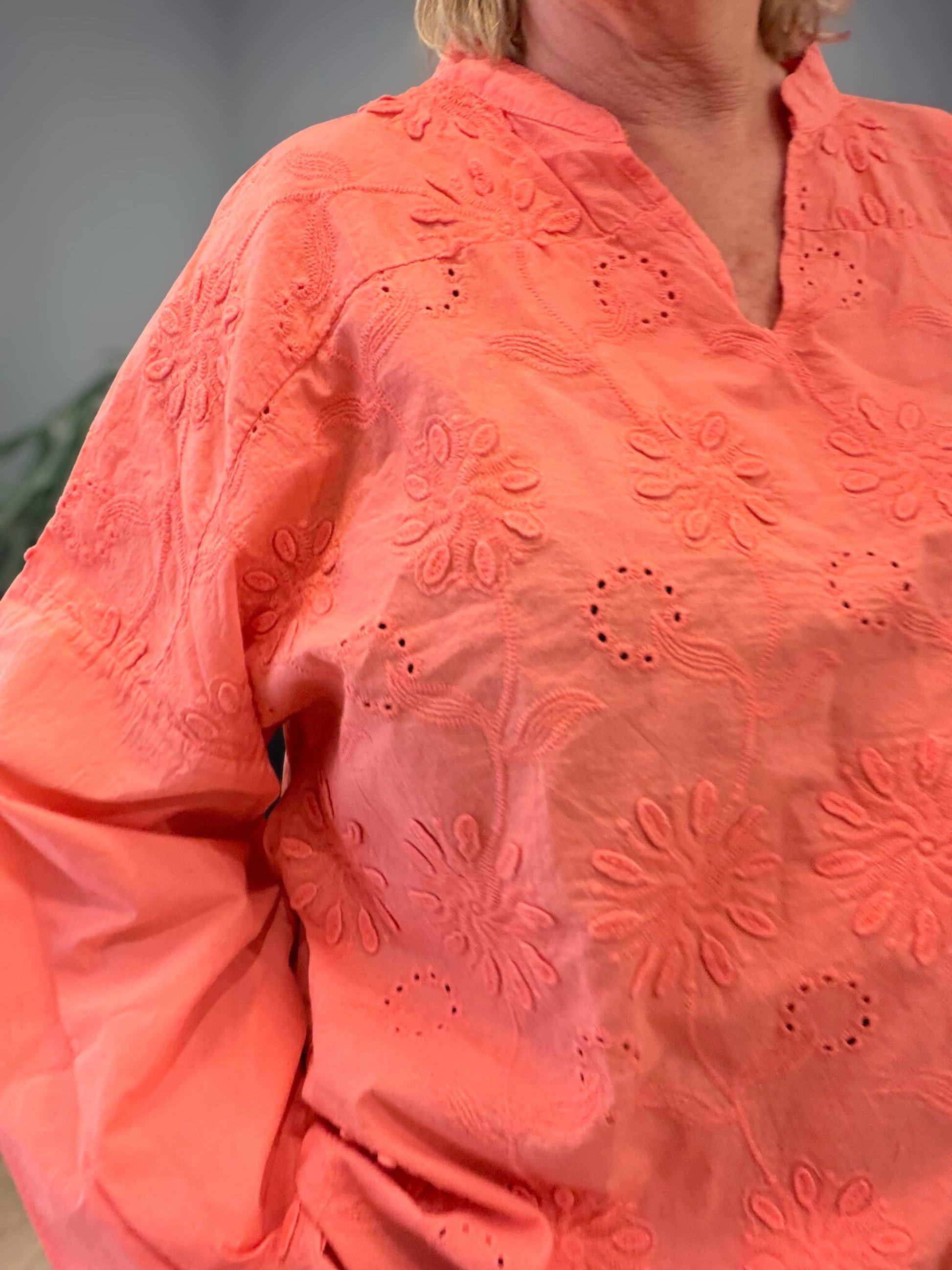 En virkelig sød tunika med smukke broderidetaljer ✨ Tunikaen har split foran og lange, løse ærmer med elastik i bunden – super feminin og behagelig 💕
