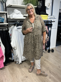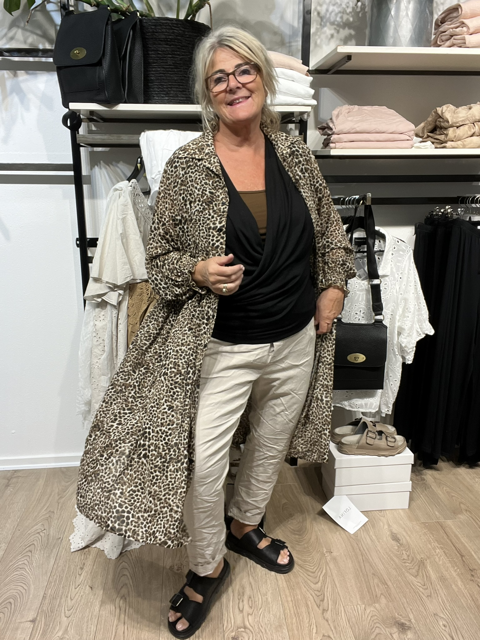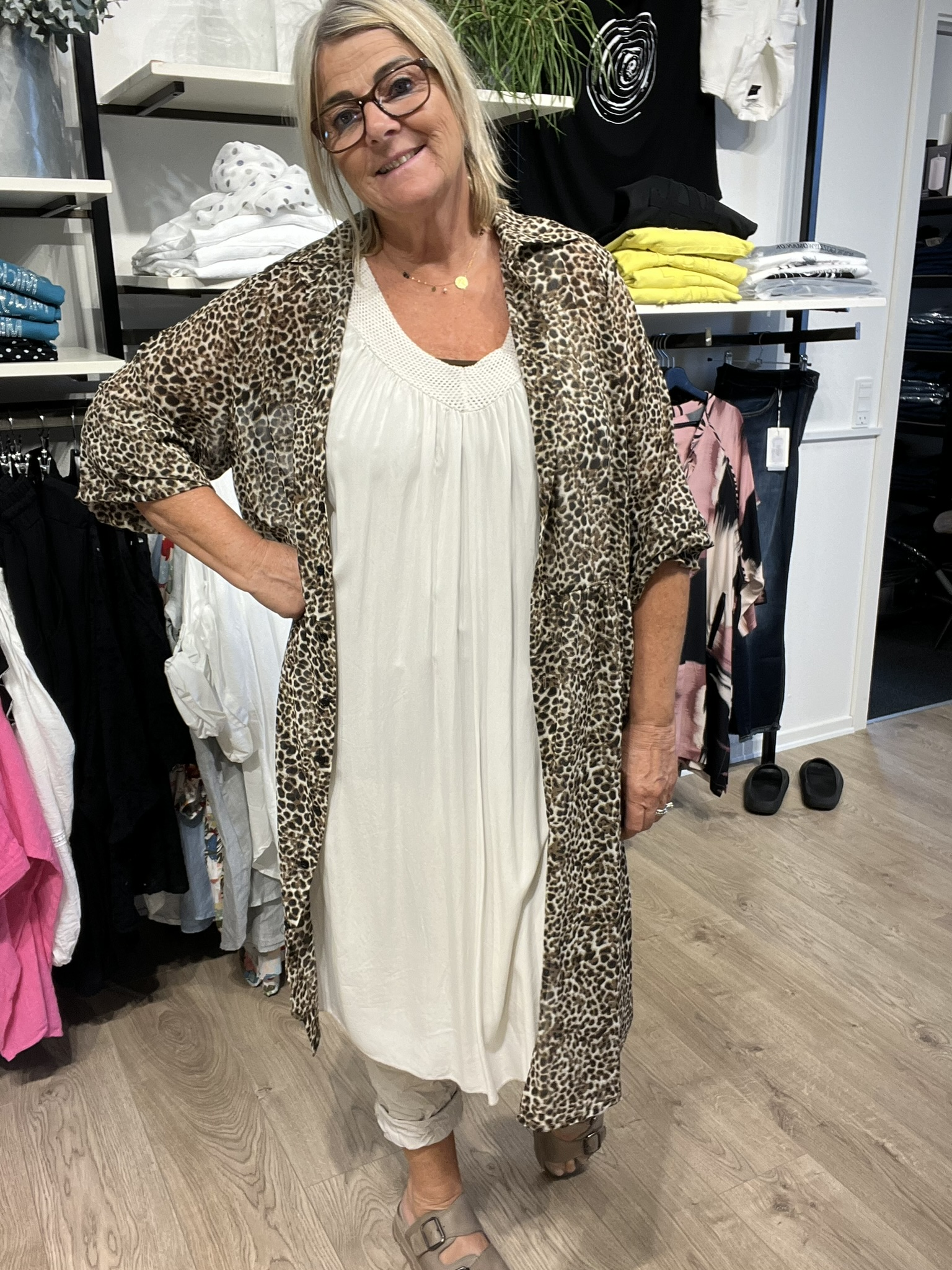 Vores Smilla Kjole har en dejlig facon. Den er gennemknappet, så den er også fin med en stropkjole under. På billed har jeg mille kjolen under i æggeskal