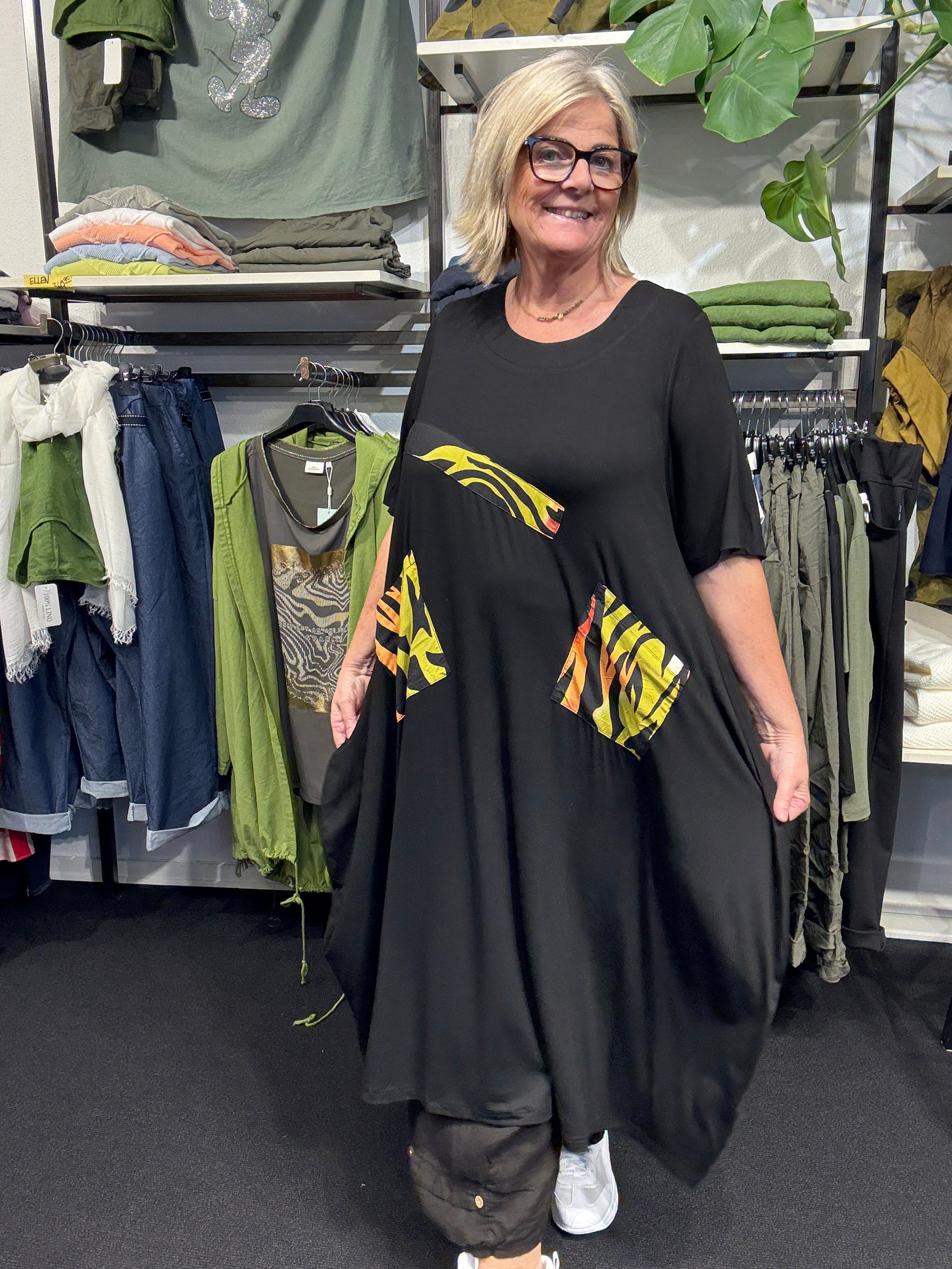 Fin lang viskose kjole som er i A-facon og med påsyet mønster.virkelig en skøn facon.
