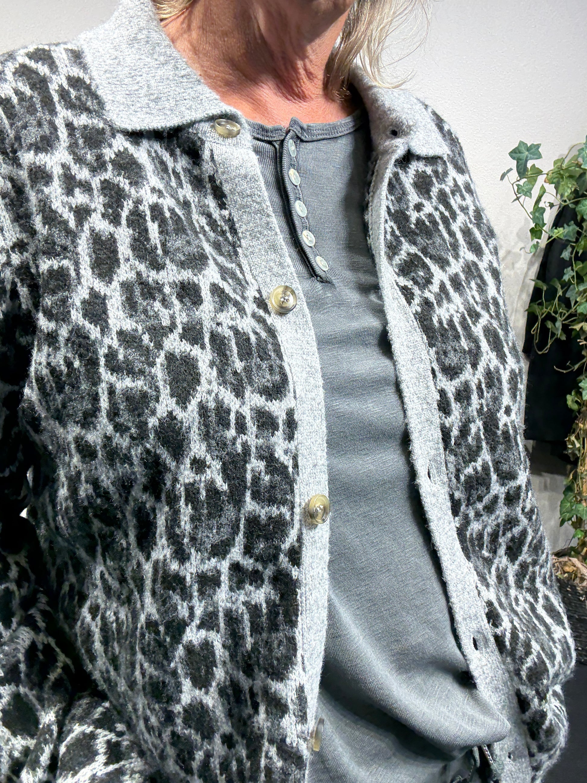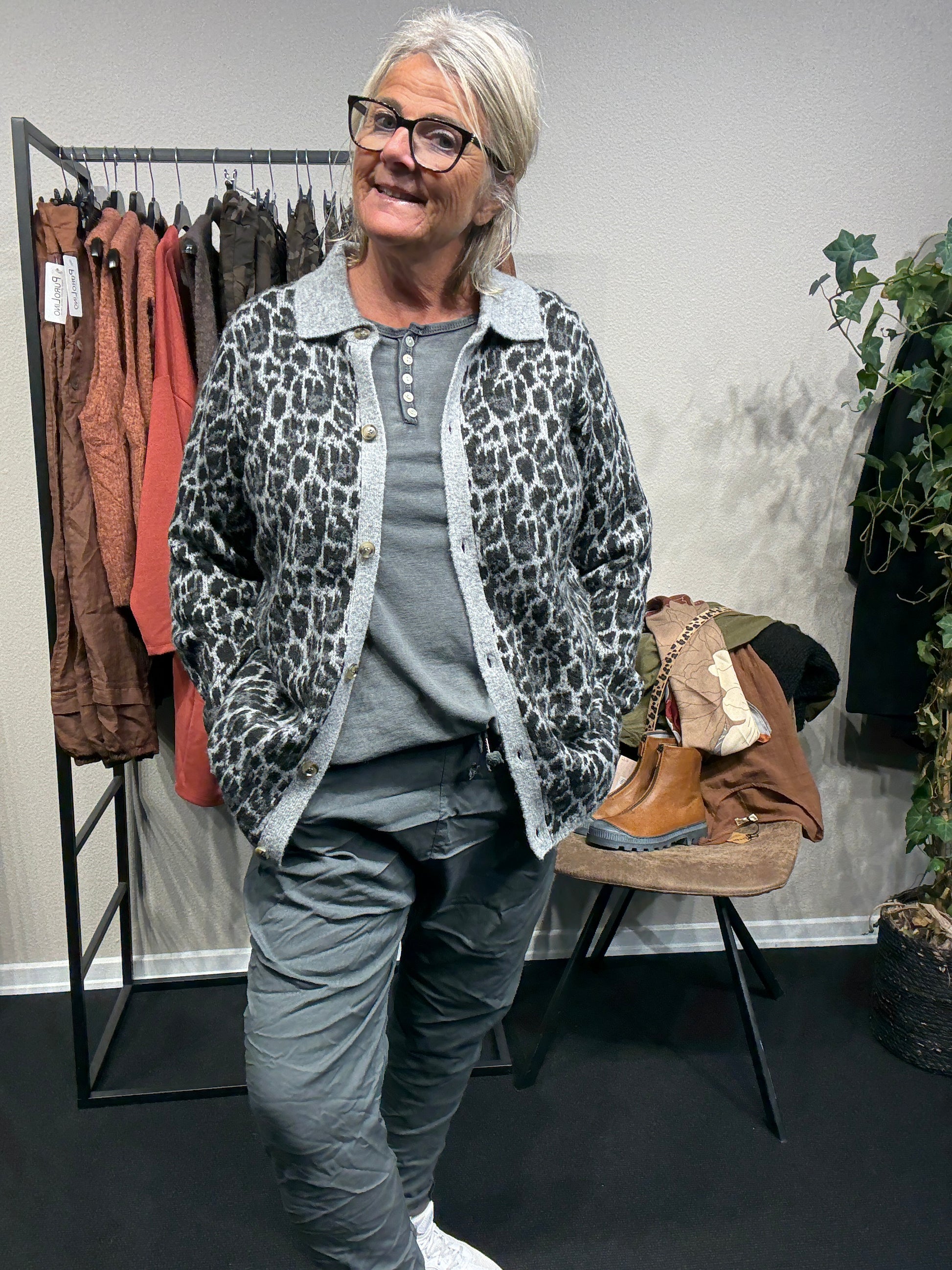 Lækker strik i et flot leopard print. Den er gennemknappet, så den kan bruges både åben og lukket, har lange ærmer og med krave. Den er dejlig blød at have på, og perfekt at bruge som et stykke overtøj såvel som inden døre.