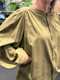 Virkelig smart gennemknappet skjorte bluse. Den er gennemknappet og kan bruges både åbent og lukket. Denne style er efter vores mening perfekt til både hverdag og fest. Læg mærke til de anderledes ærmer(ballon-effekt) og den smukke ryg med rynke-detalje.