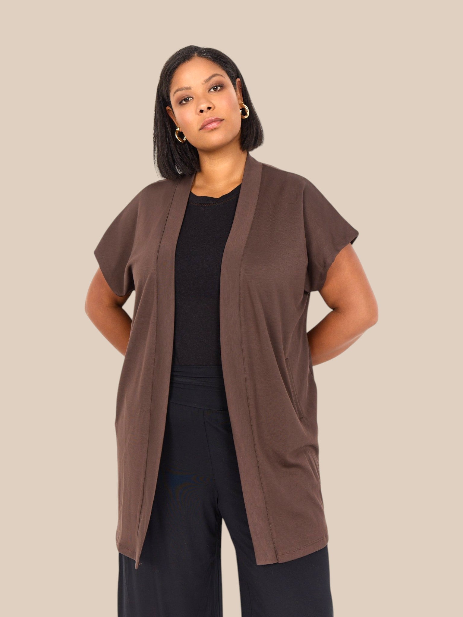 Alsidig cardigan med åben front og korte ærmer, derudover er der sidelommer. Cardiganen har en behagelig længde.