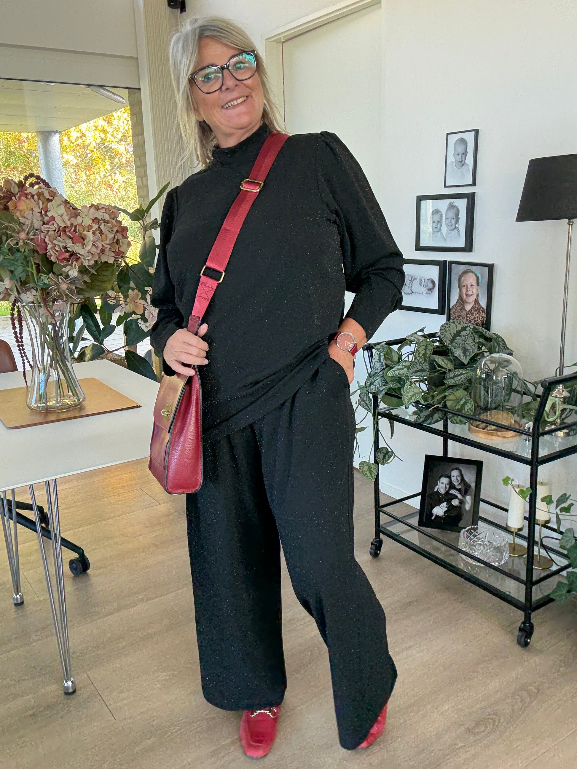 Smuk glimmer bluse som passer til bukserne af samme navn. Den er i en skøn kvalitet med masser af stræk, som gør den meget behagelig. Der er lange ærmer med en smule puf effekt ved skulderen samt flot turtleneck. flot sæt med små sølv glimmer i hverdag eller fest.