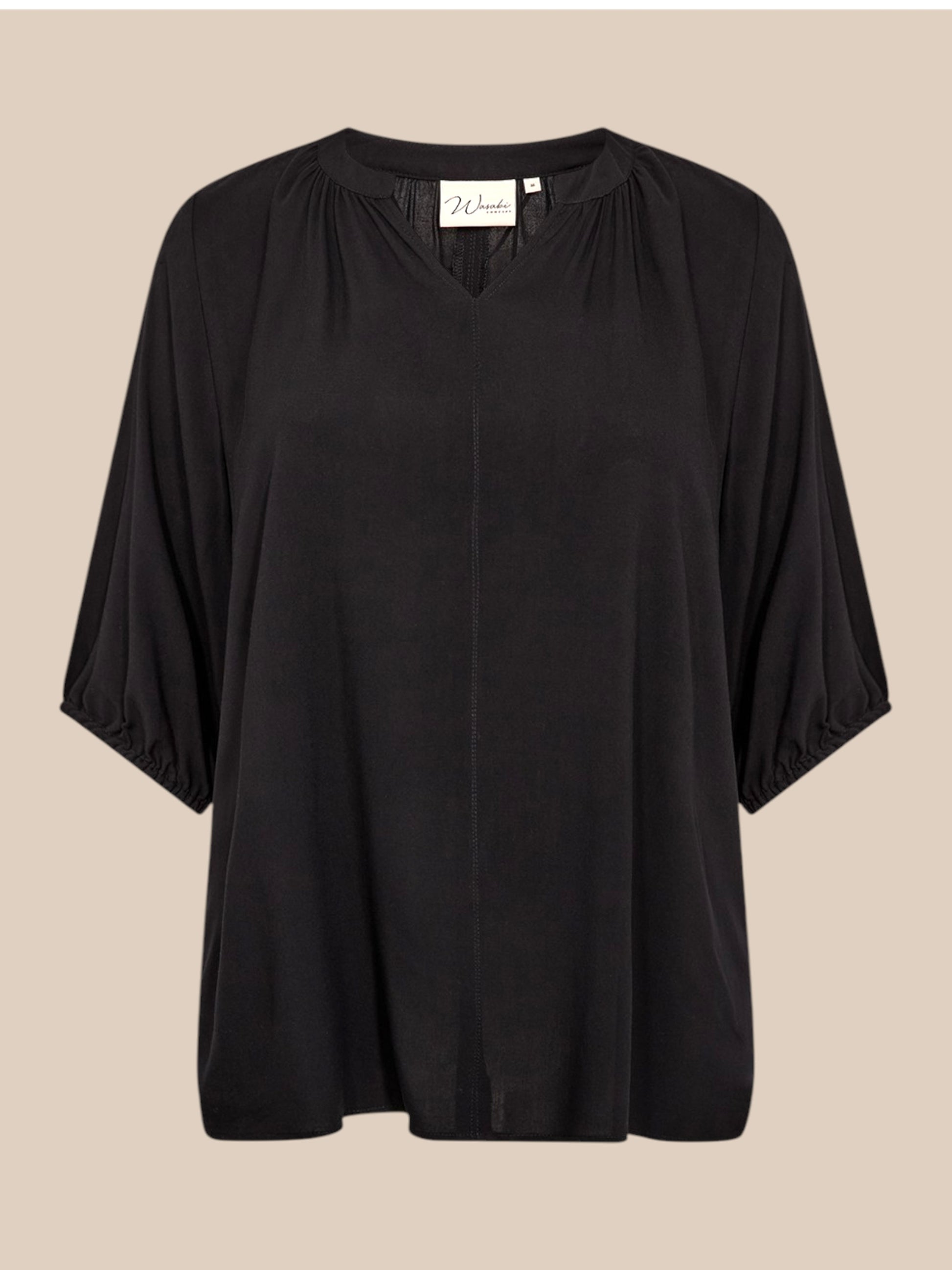 Den har V-udskæring og trekvartærmer med elastik forneden af ærme flot og klassisk look i blød fast viskose.